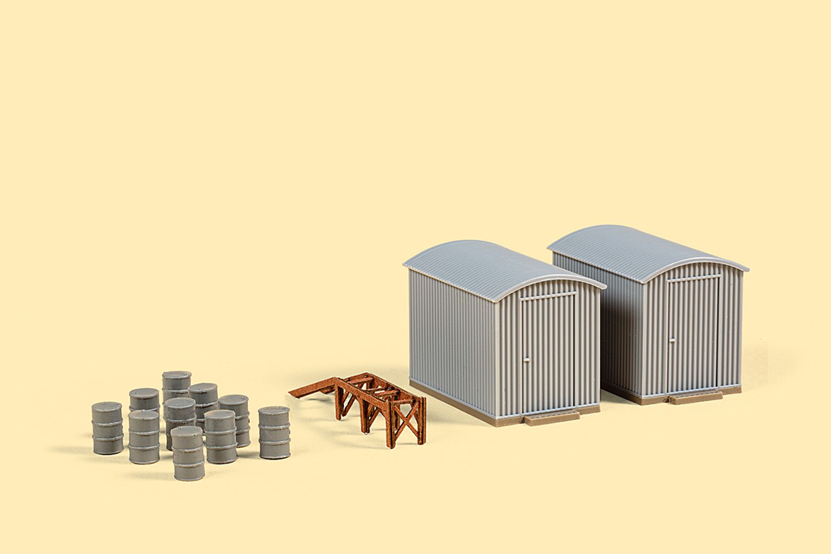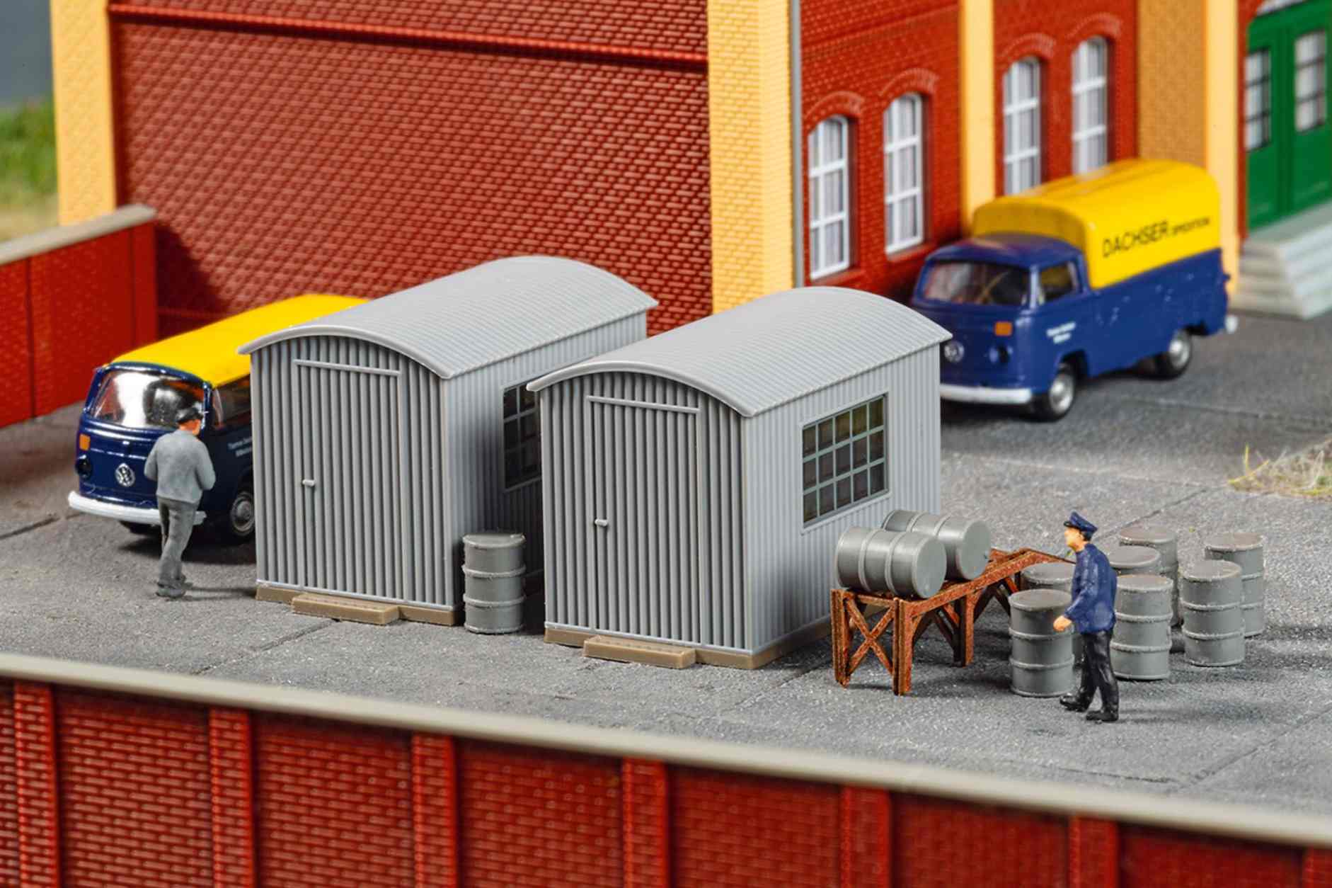 Zwei Wellblechhütten in typischer Bauform, wie sie als Öllager auf Werksgeländen oder in Bahnbereichen verwendet wurden.Zum Zubehör gehören eine Rampe aus stabilem Karton in Lasercut-Technologie sowie mehrere Fässer zur Ausgestaltung.Die Schuppen lassen sich flexibel platzieren und sind vielseitig einsetzbar.Wellblechhütte je 24 x 15 x 17 mmFassrampe 28 x 5 x 6,5 mm