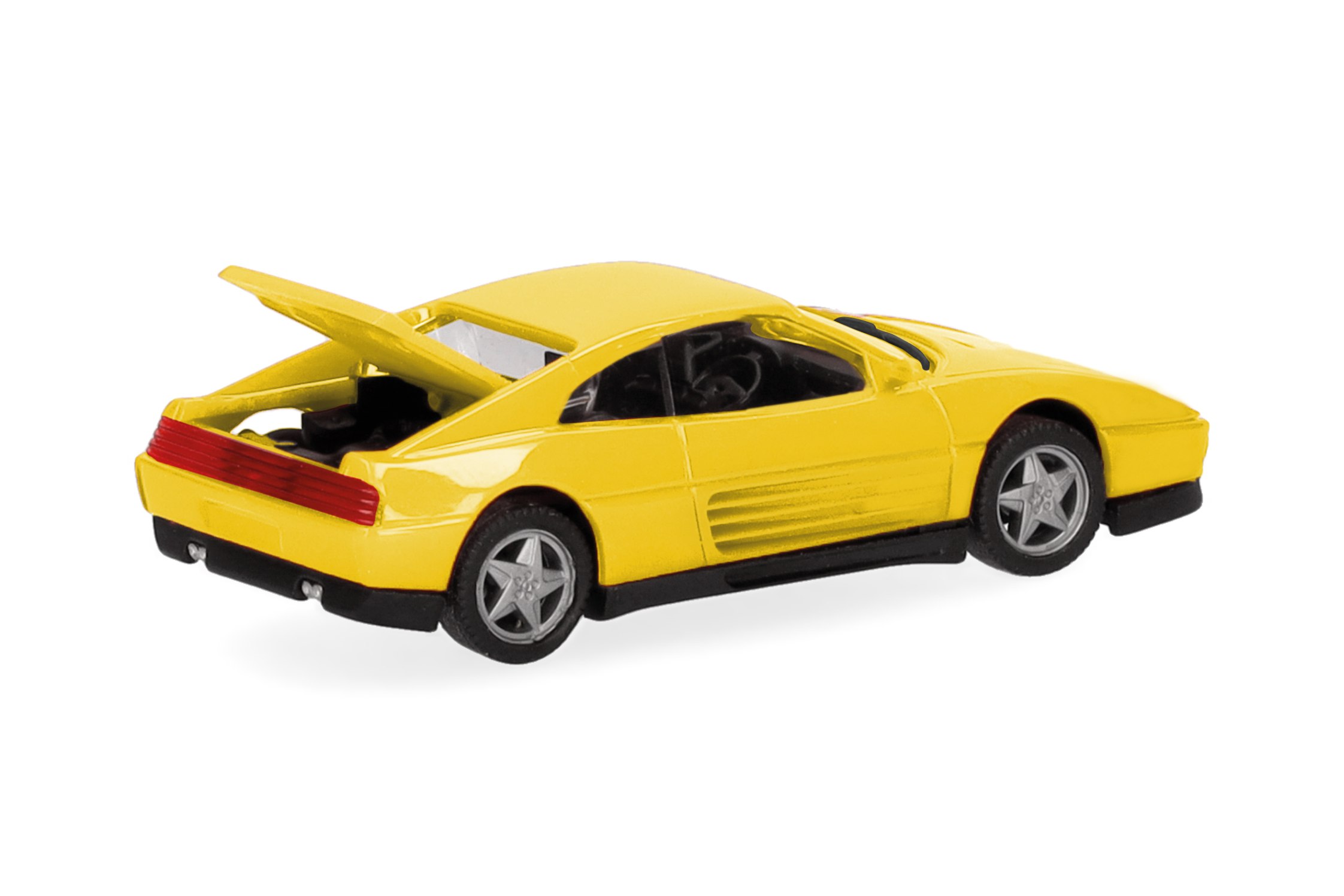 Der Ferrari 348 tb ist mittlerweile zum Klassiker geworden und erscheint nun wieder bei Herpa mit zu öffnender Motorhaube in der Farbgebung giallo fly.