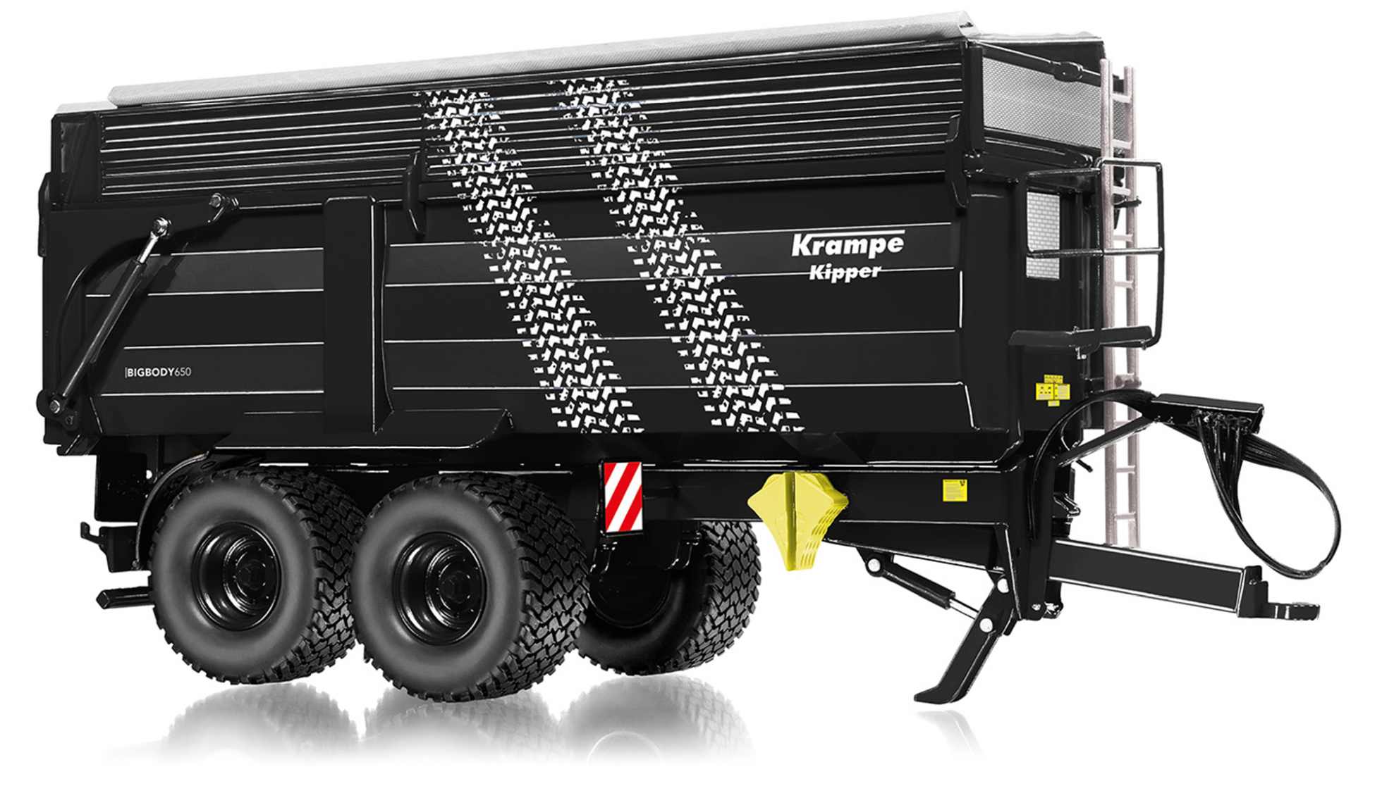 Krampe Big Body 650 hinterlässt Spuren WIKING kennt die Leidenschaft der Landmaschinenfreunde die schwarzen Modelle ihrer Favoriten sind längst zu echten Lieblingsstücken geworden. Deshalb folgt dem bekannten Big Body 650 nun eine weitere attraktive Variante natürlich wieder ganz in Schwarz! Diesmal schmücken Reifenspuren die Flanken und geben dem Modell eine markante Ausstrahlung. So macht der Präzisionsmaßstab 1:32 noch mehr Freude. Detailkraft wirkt bei jedem noch so kleinen Bauteil Mit dem Krampe Big Body 650 präsentieren die Modellbauer einen imposanten Landwirtschaftskipper, der für die Heckentladung konstruiert und einsatztauglich ist. Entsprechend des Premium-Anspruchs an die WIKING-Präzisionsmodelle lässt die Detailkraft bei jedem noch so kleinen Bauteil aufhorchen und wird dem Vorbildcharakter gerecht. Der Aufbau des Krampe-Originals besteht immerhin aus vier Millimeter starken Seitenwänden und Bodenblech, das durch eine Rahmenkrone verstärkt wird. Der Big Body 650 ist für 40 km/h zugelassen, so dass einem zügigen Erntetransport nichts im Wege steht. Funktionalität in 1:32 ganz nahe am Krampe-Vorbild Und auch beim WIKING-Modell fehlt es an nichts. Die Deichsel ist höhenverstellbar, der Stützfuß beweglich, die Leiter abnehmbar und in verschiedenen Höhen positionierbar. Die hintere Achse wird lenkbar ausgeführt. Selbstverständlich ist die Mulde kippbar, die Heckklappe inklusive Silageauslass beweglich. Beim Big Body 650 wird der Silageaufsatz ebenso miniaturisiert wie die Schrägdachplane die Abdeckfolie ist authentisch aufrollbar. Und natürlich kann sich der WIKING-Freund und Landmaschinenenthusiast über eine immerhin ein halbes Dutzend Exemplare große Palette an Schleppern freuen. Genau in der wechselweisen Kombination der Gespanne liegt der Reiz dieses Maßstabs, der auch für Technikbegeisterte keine Wünsche offenlässt.