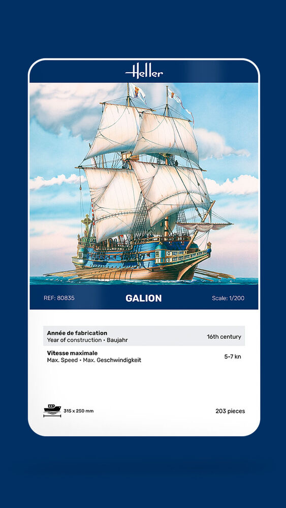 Die Nachbildung der Spanischen Galeone von Heller, haben wir einigen Unterlagen aus der damaligen Zeit zu verdanken. Die Galeonen waren große Umschlagschiffe, auf denen die Spanier während der Regierungszeit von Karl V. meist Gold und sonstige Güter aus Südamerika und Mexiko mitbrachten.