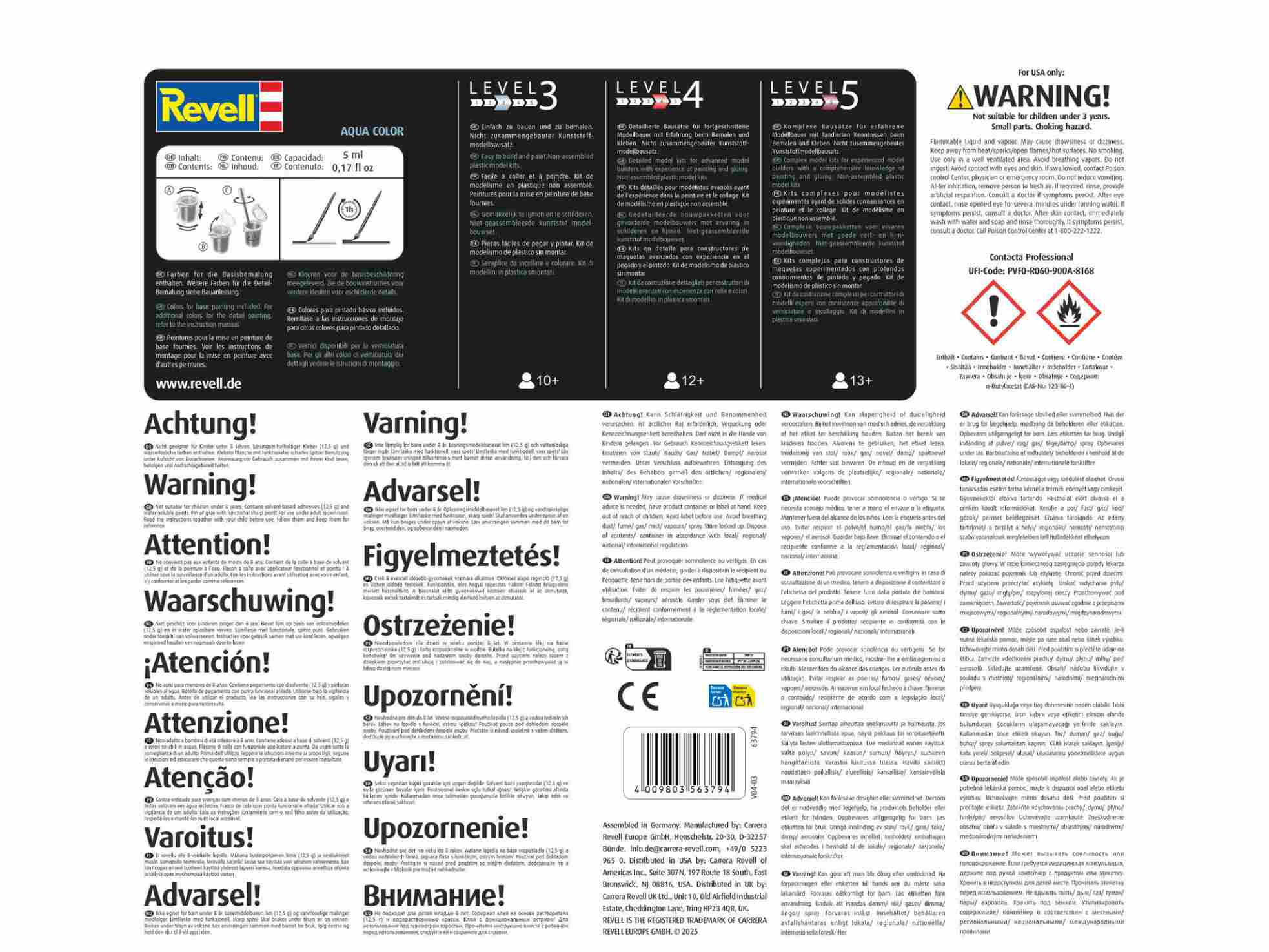 Plastikmodellbausatz (nicht zusammengebaut) Bebilderte, mehrsprachige Bauanleitung Abziehbildersatz Pinsel Grundfarben (Revell Aqua Color) Klebstoff (Revell Contacta Professional Mini)