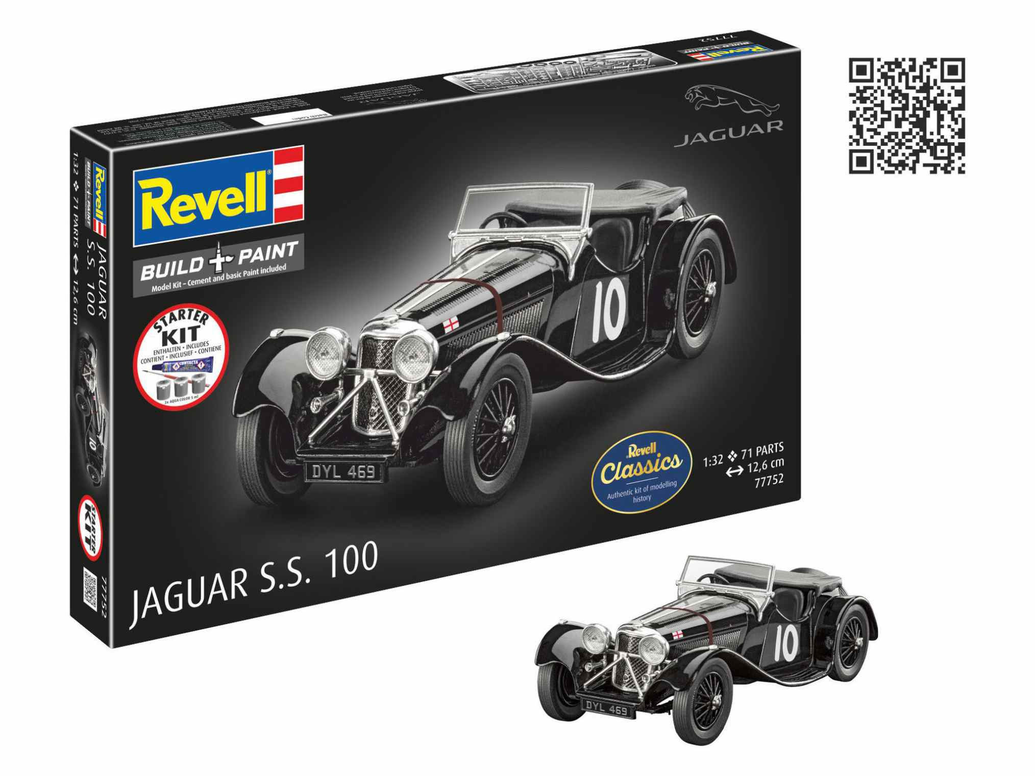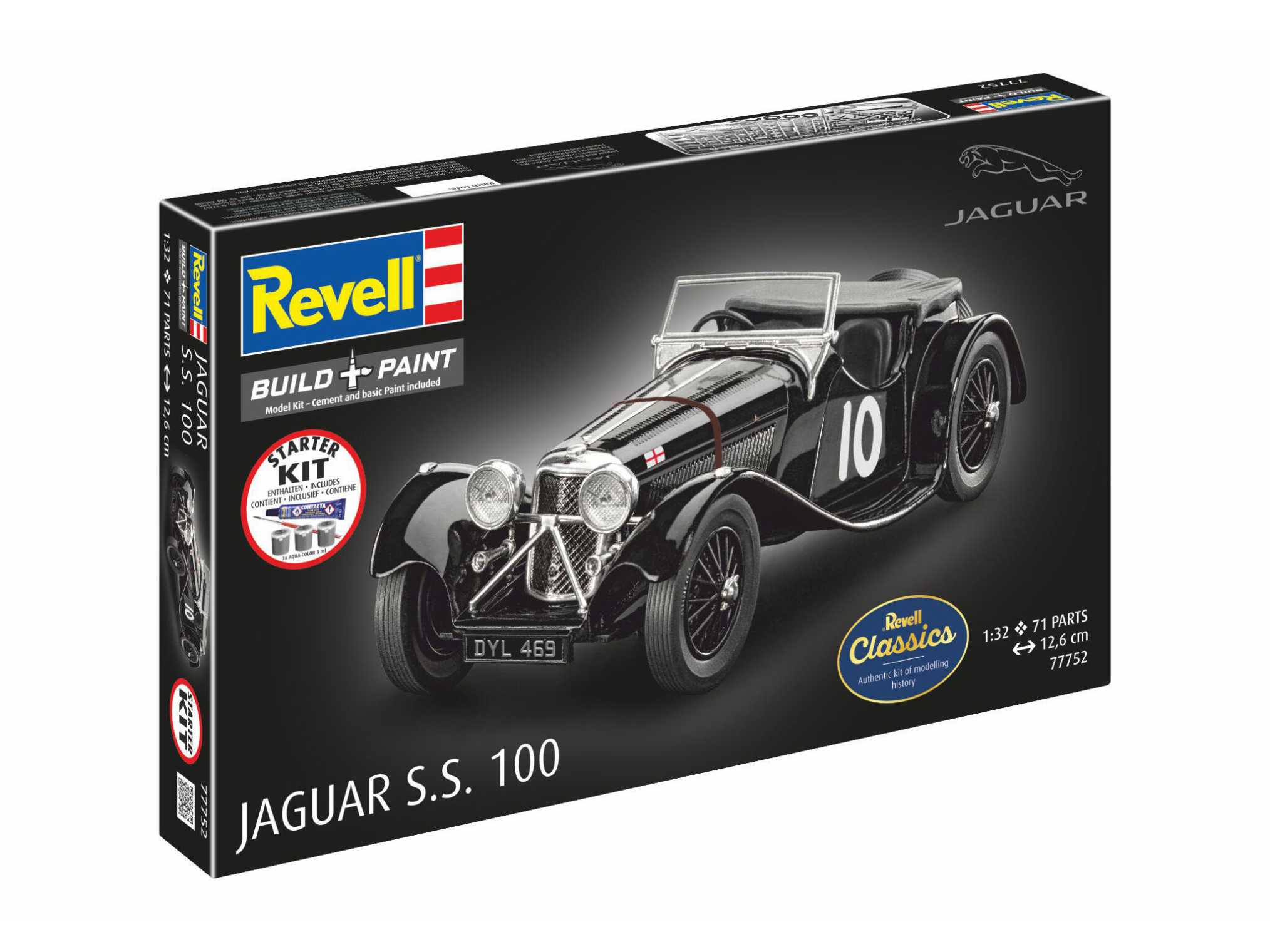 Der ab 1935 gefertigte, bis zu 100 Meilen pro Stunde (= 160 km/h) schnelle S.S. trug als erstes Fahrzeug die Bezeichnung Jaguar im Namen. Wegen der abgeschrägten Kotflügel und seines flachen Profils gilt der zweisitzige Roadster oft als schönster Sportwagen der Vorkriegszeit. - Mehrteilige Karosserie - Filligrane Speichenfelgen - Authentische Abziehbilder Neben Basisfarben sind auch Kleber und Pinsel enthalten.