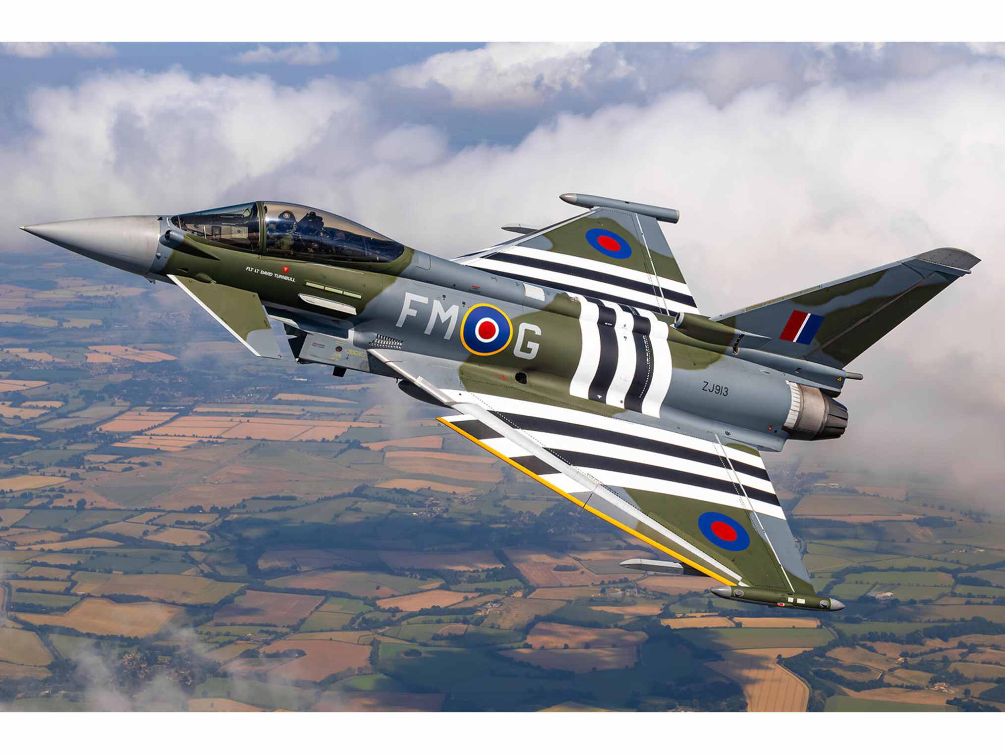 Modellbausatz des Eurofighter Typhoon mit der besonderen Lackierung für die Sonderversion, die 2024 das gesamte Jahr über zu sehen war und oft als Moggy bezeichnet wurde. Zur Erinnerung an den 80. Jahrestag der D-Day-Landungen hatte das Flugzeug mit der Seriennummer ZJ913 Markierungen, die auf einer Hawker Typhoon der 257. Staffel basierten. . Detailliertes Cockpit . Bewegliche Canard-Flügel . Jet-Düsen in zwei Konfigurationen . Detaillierte Luftbremse . Sonde zur Betankung in der Luft . Zwei externe Flügeltanks Authentische Darstellung folgender Versionen: - BAE Systems Typhoon FGR.4 ZJ913, flown by Flt Lt David Turbo Turnbull, 29 Squadron, Royal Air Force, based at RAF Coningsby, 2023 - BAE Systems Typhoon FGR.4 ZJ913 Moggy, RAF Typhoon display team, flown by Flt Lt David Turbo Turnbull, 29 Squadron, Royal Air Force, based at RAF Coningsby, 2024