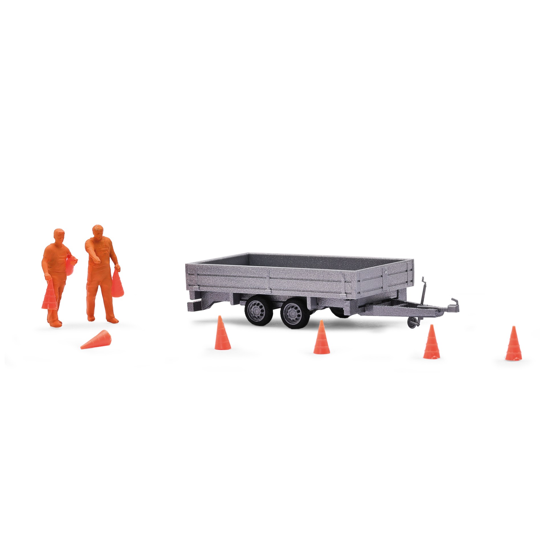 Bei Unfall, Straßenarbeiten oder an gefährlichen Stellen dienen Verkehrshütchen zur Absicherung. Dieser umfangreiche Bausatz enthält einen Tandem-Anhänger, 2 Figuren (unbemalt) beim Aufstellen der Verkehrshütchen und 8 Leitkegel.