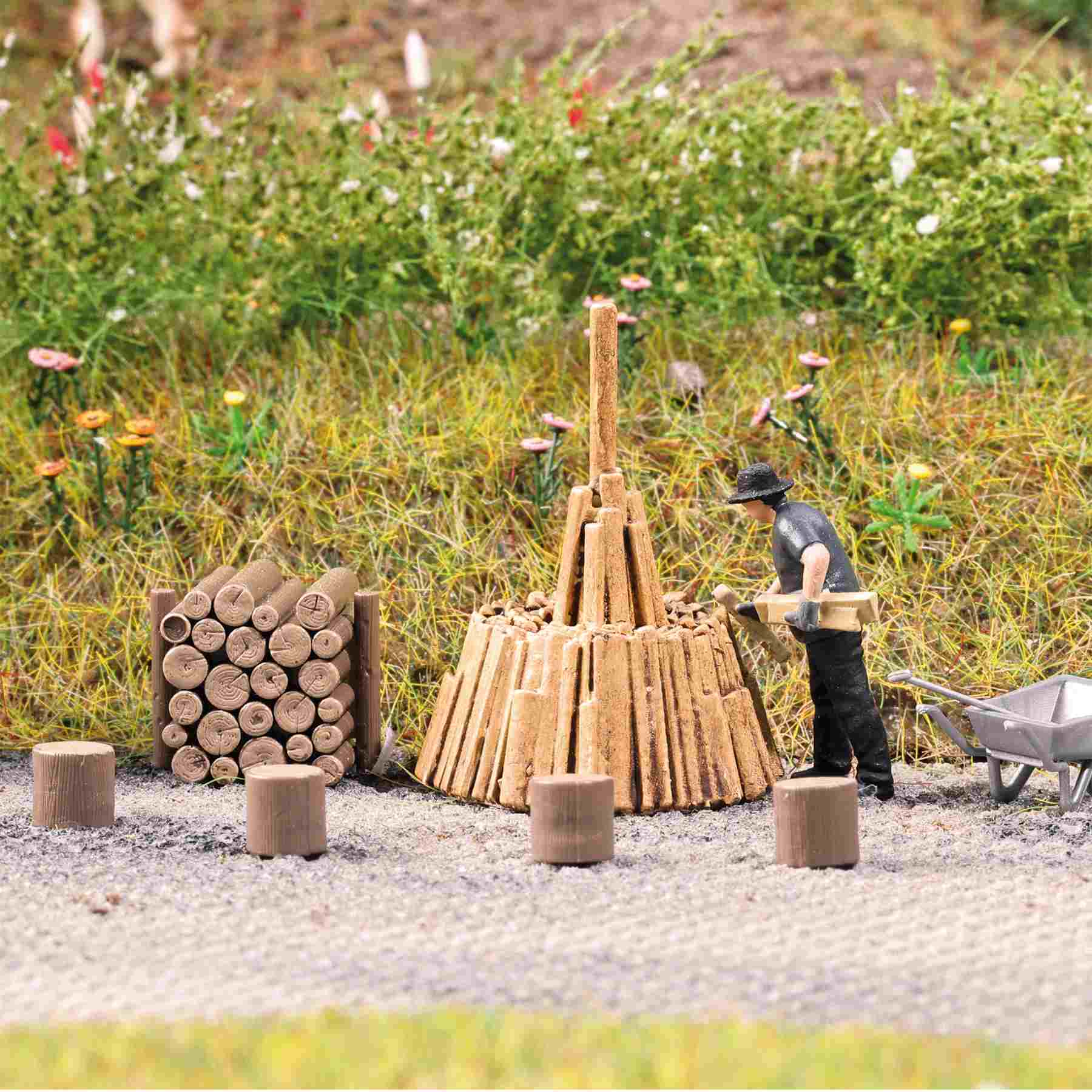 Der Köhler formt sorgfältig einen Holzkegel für den Kohlemeiler. Das Action Set enthält außerdem vier Baumstümpfe, Holzstapel, Schubkarre und Werkzeug.