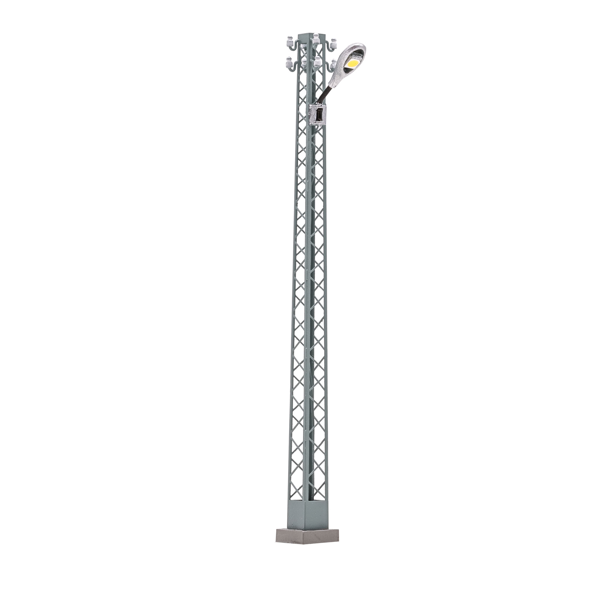 Typische Industrieleuchte, wie sie seit den 1960er Jahren in der DDR eingesetzt wurde und auch heute noch weit verbreitet ist. Filigrane Ausführung vom Gittermast aus Metall und den Isolatoren am oberen Mast. Die ovale Leuchtenform stellt das Modell einer häufig eingesetzten Leuchtentype aus der Fertigung des ehemaligen VEB Leuchtenbau Leipzig (LBL) dar. Das gelb/orangene Licht wurde im Original durch Natriumdampflampen erzeugt und wird hier im Modell durch gelb/orange-leuchtende LEDs vorbildlich wiedergegeben. Der Gittermast kann mit weiteren Leuchtkörpern aus dem Set H0 TT 4133 bestückt werden. Fertigmodell. Höhe: 78 mm.