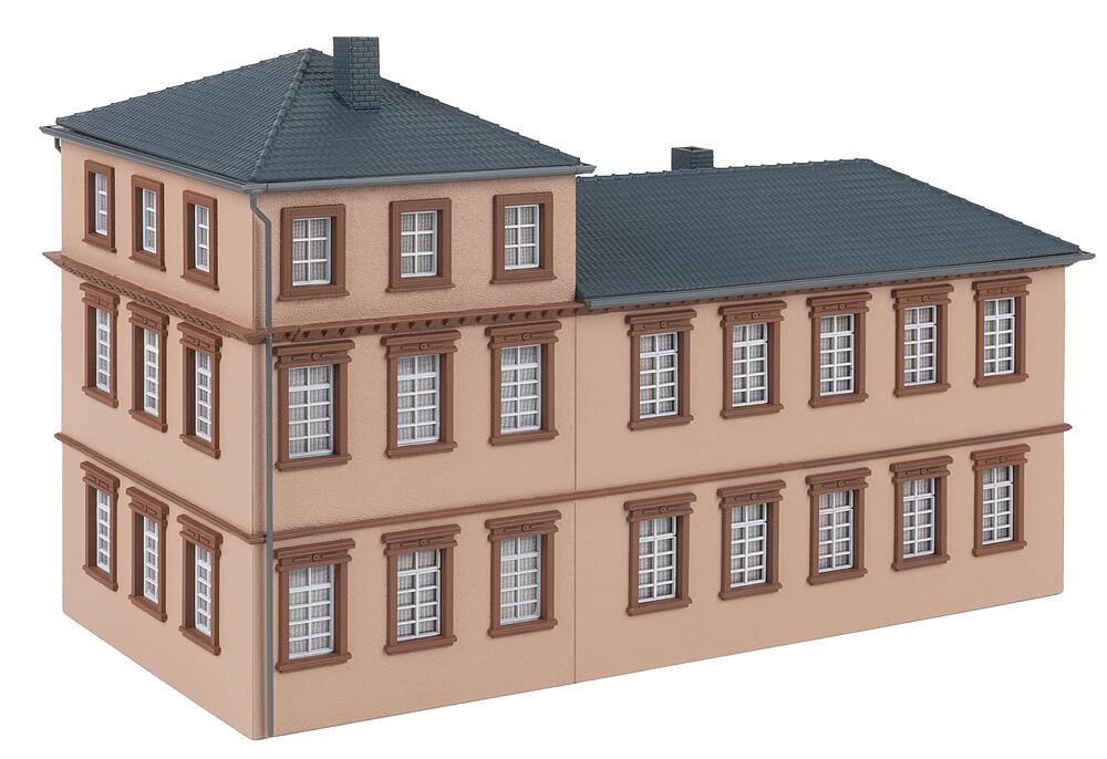 Ein sandfarbenes Gebäude, bestehend aus einem zweigeschossigen Hauptgebäude und einem dreigeschossigen integrierten Anbau. Beide Gebäudeteile sind mit grau gedeckten Walmdächern versehen. Dunkelbraune Zierleisten rahmen die weißen Fenster ein und setzen dezente Kontraste. Eine große Tür bildet den Haupteingang und führt ins Innere des Hauptgebäudes. Ideal geeignet zur Darstellung eines Schul- oder Verwaltungsgebäudes im städtischen Umfeld. : EP: III : Maße (L x B x H): 282 x 130 x 177 mm : patiniert: : Schwierigkeitsgrad: Anspruchsvoll : Bausatz Inhalt: Dieser Bausatz enthält: 347 Einzelteile in 5 Farben, Fensterfolie, 1 Gardinenmaske und 1 Bauanleitung. Verwenden Sie zum Basteln FALLER EXPERT Plastikkleber. : Zusatzangaben: : Beleuchtung/Elektrik: 2 x 180667 : Sicherheitshinweise: https://medien.faller.de/xs_db/DOKUMENT_DB/www/allgemeines/FALLER_Sicherheitshinweise_1008010.pdf