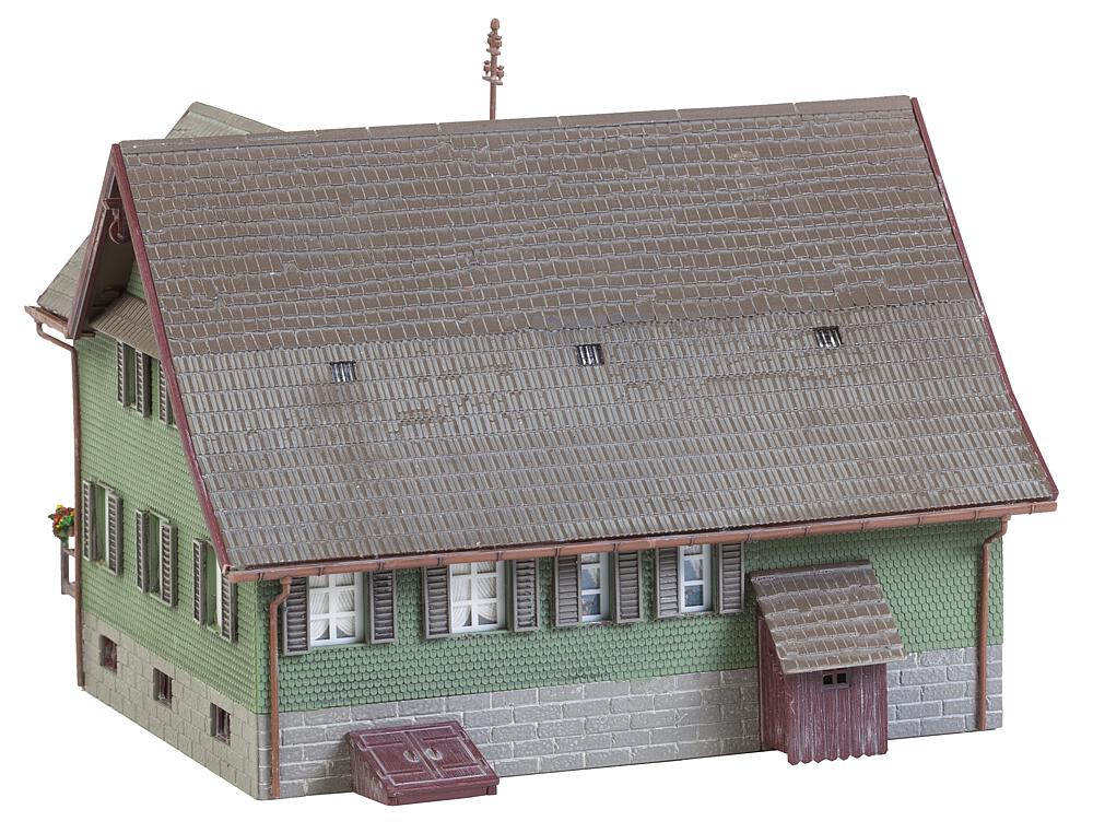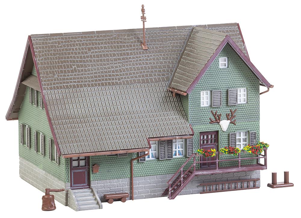 Zweistöckiges Jagdhaus auf einem Steinsockel und mit grüner Schindelverkleidung, das sich perfekt in den umliegenden Wald einfügt. Zu den Besonderheiten des Modells gehören der dritte Giebel, die Dacheindeckung aus zweierlei Ziegeln und das exponierte Geweih als Fassadenschmuck über dem Hauseingang. Stilles Örtchen und Kellerfalle finden sich auf der rückwärtigen Seite. Einzelne Dachziegel können auf Wunsch durch beiliegende Glasziegel ersetzt werden. : EP: I : Maße (L x B x H): 138 x 120 x 110 mm : patiniert: : Schwierigkeitsgrad: Moderat : Bausatz Inhalt: Dieser Bausatz enthält: . : Zusatzangaben: : Beleuchtung/Elektrik: : Sicherheitshinweise: https://medien.faller.de/xs_db/DOKUMENT_DB/www/allgemeines/FALLER_Sicherheitshinweise_1008010.pdf