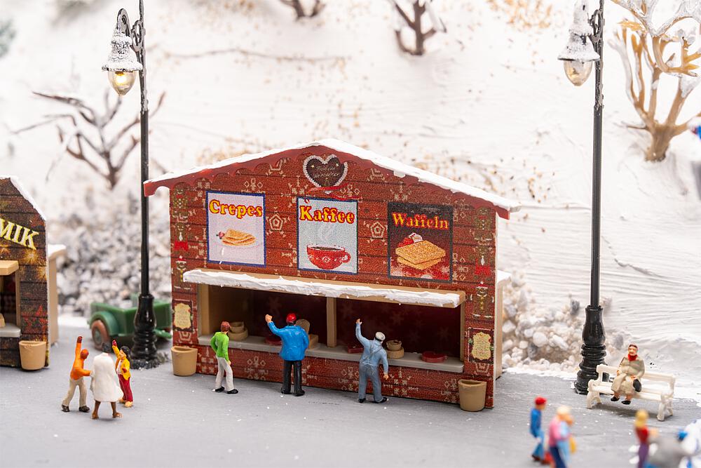 Zwei liebevoll gestaltete Miniatur-Holzbuden laden zum Verweilen auf dem Weihnachtsmarkt ein. Aus... mehr