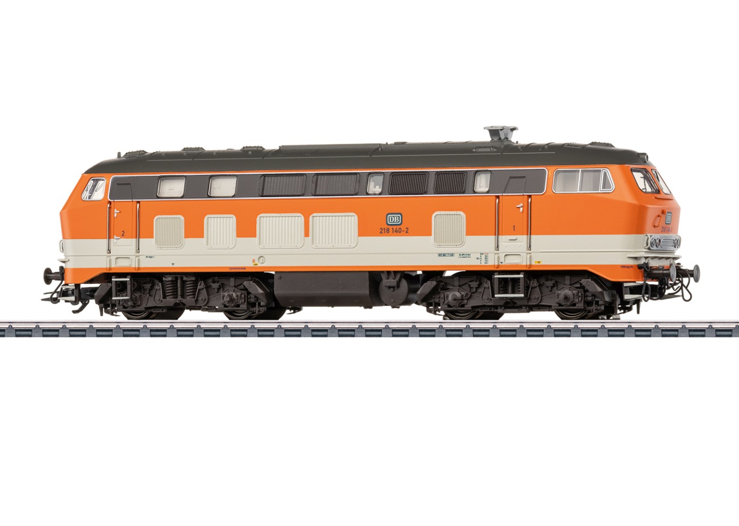 Vorbild: Diesellokomotive Baureihe 218 der Deutschen Bundesbahn. Reinorange/Kieselgraue Grundfarbgebung. Betriebsnummer 218 140-2. Betriebszustand ab 1985.Modell: Mit Digital-Decoder mfx+ und umfangreichen Geräuschfunktionen. Geregelter Hochleistungsantrieb mit Schwungmasse zentral eingebaut. Alle vier Achsen angetrieben. Haftreifen. Fahrtrichtungsabhängig wechselndes Dreilicht-Spitzensignal und zwei rote Schlusslichter konventionell in Betrieb, digital schaltbar. Spitzensignal an Lokseite 2 und 1 jeweils digital separat abschaltbar. Doppel-A-Licht-Funktion. Führerstandsbeleuchtung mit der Fahrtrichtung wechselnd und Maschinenraumbeleuchtung digital schaltbar. Beleuchtung mit wartungsfreien warmweißen und roten Leuchtdioden (LED). Mit Pufferspeicher. Angesetzte Griffstangen seitlich und stirnseitig aus Metall. Pufferhöhe nach NEM. Kinematikgeführte Kurzkupplungen. Bremsleitungen und Schraubenkupplungen liegen als separat ansteckbare Teile bei. Länge über Puffer 18,9 cm.Passende Personenwagen der Citybahn finden Sie im Märklin H0-Sortiment unter der Artikelnummer 43833, 43835 und 42831.Dieses Modell finden Sie in Gleichstromausführung im Trix H0-Sortiment unter der Artikelnummer 22646.