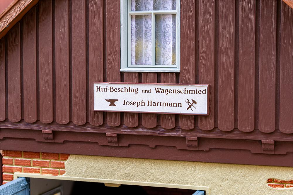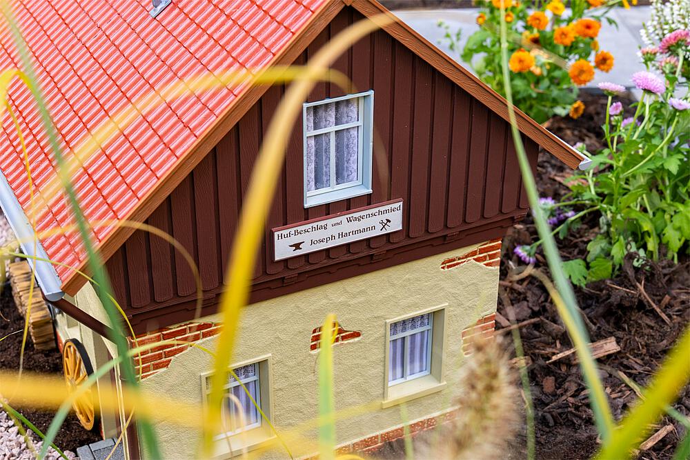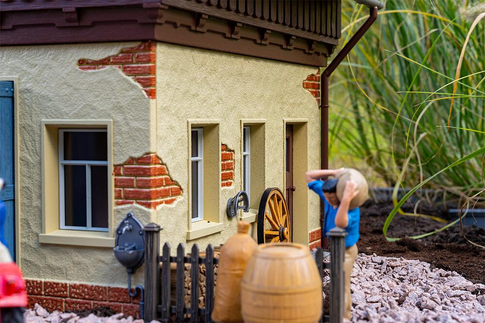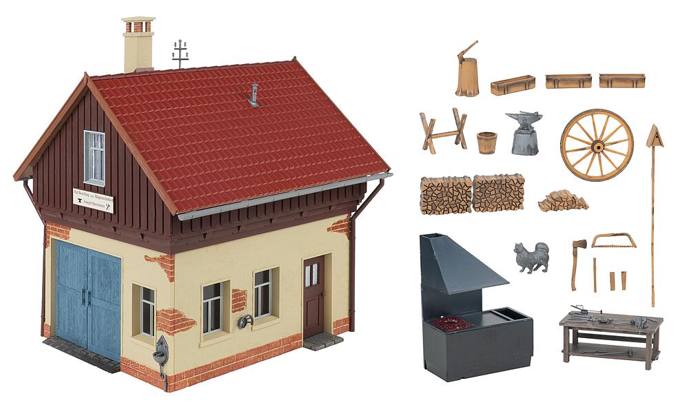 Hier wird noch von Hand gearbeitet! Mit diesem detailreichen Modell einer historischen Dorfschmiede holen Sie das traditionelle Handwerk vergangener Zeiten auf Ihre Gartenbahn-Anlage. Die Schmiede besticht durch massives Mauerwerk im Erdgeschoss, kombiniert mit einem holzverkleideten Giebelbereich und einem klassischen Satteldach mit roten Dachziegeln, die der Schmiede ihren einzigartigen Charme verleihen. Die großen blauen Doppeltore gewähren Einblick in die detailreich eingerichtete Werkstatt. Umfangreich ausgestattet ist die Schmiede mit einer Esse, einem Amboss, zahlreichen Werkzeugen, einer Werkbank, einem Wagenrad sowie verschiedenen Holzkomponenten. : EP: II : Maße (L x B x H): 333 x 326 x 390 mm : patiniert: : Schwierigkeitsgrad: Moderat : Bausatz Inhalt: : Zusatzangaben: : Beleuchtung/Elektrik: : Sicherheitshinweise: https://medien.faller.de/xs_db/DOKUMENT_DB/www/allgemeines/FALLER_Sicherheitshinweise_1008010.pdf