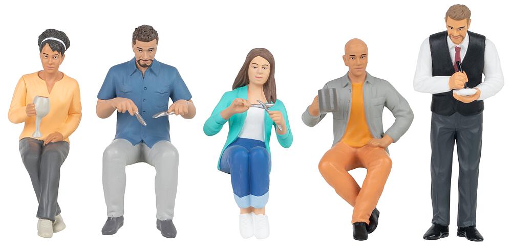 Essen, trinken, genießen! Fünf moderne Restaurantgäste und ein aufmerksamer Kellner bringen authentisches Leben in Ihre Szenen. Zwei Gäste greifen bereits zu Messer und Gabel, während eine Frau entspannt ihr Getränk genießt. Ein weiterer Gast lehnt sich zurück mit einem Bierkrug in der Hand. Der Kellner nimmt mit freundlichem Lächeln die Bestellung auf. Perfekt geeignet zur Gestaltung von Restaurants, Straßencafés oder Biergärten - für realistische Alltagsszenen in Ihrer Modellwelt. : EP: V : Maße (L x B x H): : patiniert: : Schwierigkeitsgrad: : Bausatz Inhalt: Dieser Artikel enthält: 5 Figuren. : Zusatzangaben: : Beleuchtung/Elektrik: : Sicherheitshinweise: https://medien.faller.de/xs_db/DOKUMENT_DB/www/allgemeines/FALLER_Sicherheitshinweise_1008010.pdf
