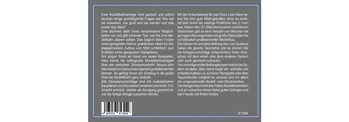 Dies Büchlein stellt Ihnen verschiedene Möglichkeiten vor und gibt konkrete Tipps, wie Sie eine Modellbahn planen sollten. Das beginnt beim Finden eines geeigneten Motivs, praktischen Ideen für den etappenweisen Aufbau und führt schließlich zum Erstellen eines geeigneten Gleisplanes.
