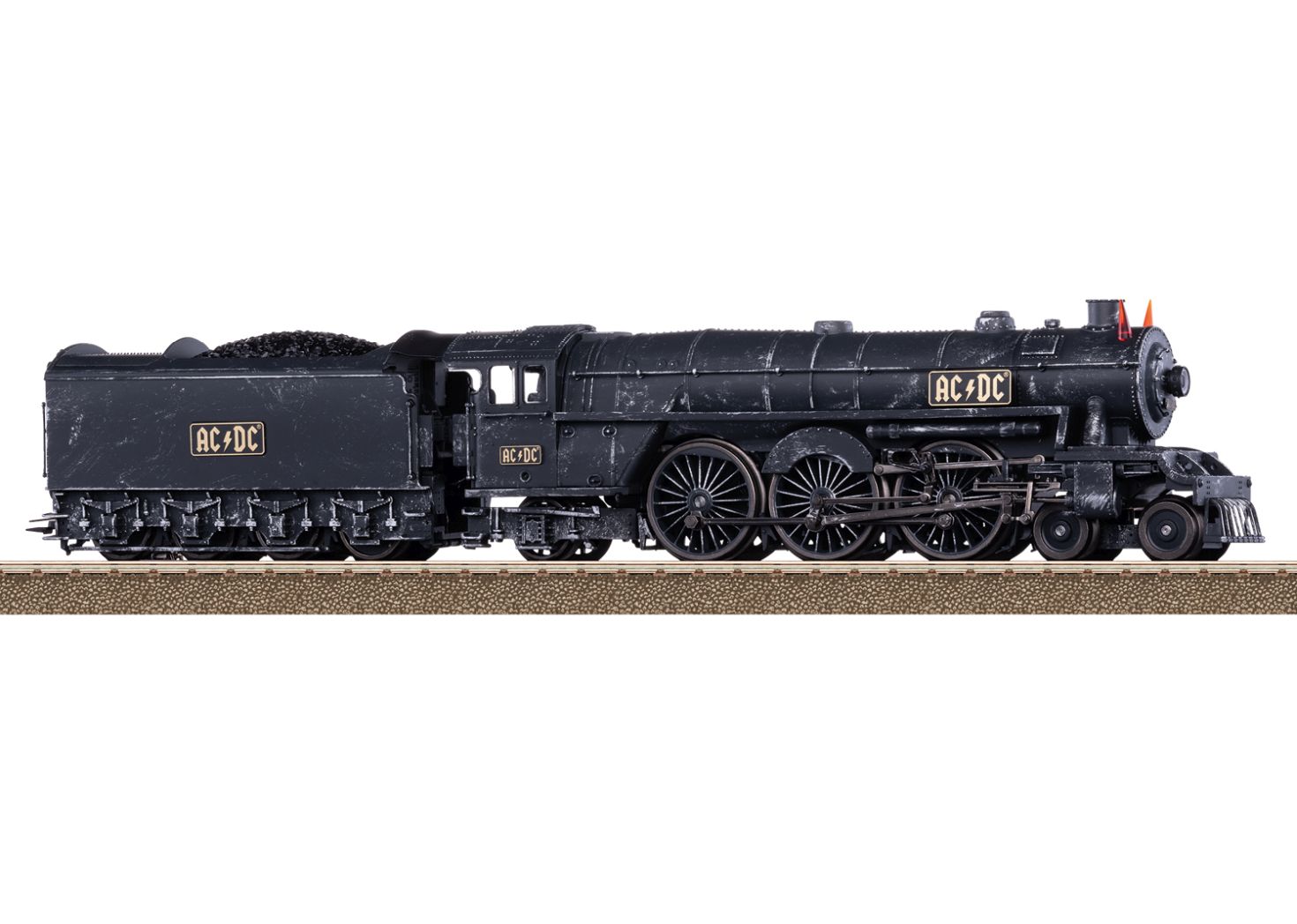 Modell: Mit Digital-Decoder und umfangreichen Licht- und Soundfunktionen. Geregelter Hochleistungsantrieb mit Schwungmasse im Kessel. Drei Achsen angetrieben. Haftreifen. Lokomotive und Tender weitgehend aus Metall. Serienmäßig eingebauter Raucheinsatz, mit geschwindigkeitsabhängigem, dynamischem Rauchausstoß, digital schaltbar. Frontscheinwerfer mittig auf der Rauchkammertür der Lok und eine Lampe an der Tenderrückseite konventionell in Betrieb, digital schaltbar. Die Beleuchtung des Frontscheinwerfers kann auf rot umgeschaltet werden. Die AC/DC typischen Teufelshörner sind beleuchtet und können digital zugeschaltet werden. Führerstandsbeleuchtung und Feuerbüchsenflackern digital schaltbar. Beleuchtung des Tender-Durchgangs digital schaltbar. Beleuchtung mit wartungsfreien warmweißen und roten Leuchtdioden (LED). Verstellbare Kurzkupplung mit Kinematik zwischen Lok und Tender. Am Tender kinematikgeführte Kurzkupplung mit NEM-Schacht. Pufferhöhe an Lok und Tender nach NEM. Bremsschläuche, Schraubenkupplungsimitationen und geschlossene Zylinderdeckel liegen bei. Länge über Puffer ca. 24,5 cm.Dieses Modell finden Sie in Wechselstrom-Ausführung im Märklin H0-Sortiment unter der Artikelnummer 39966.