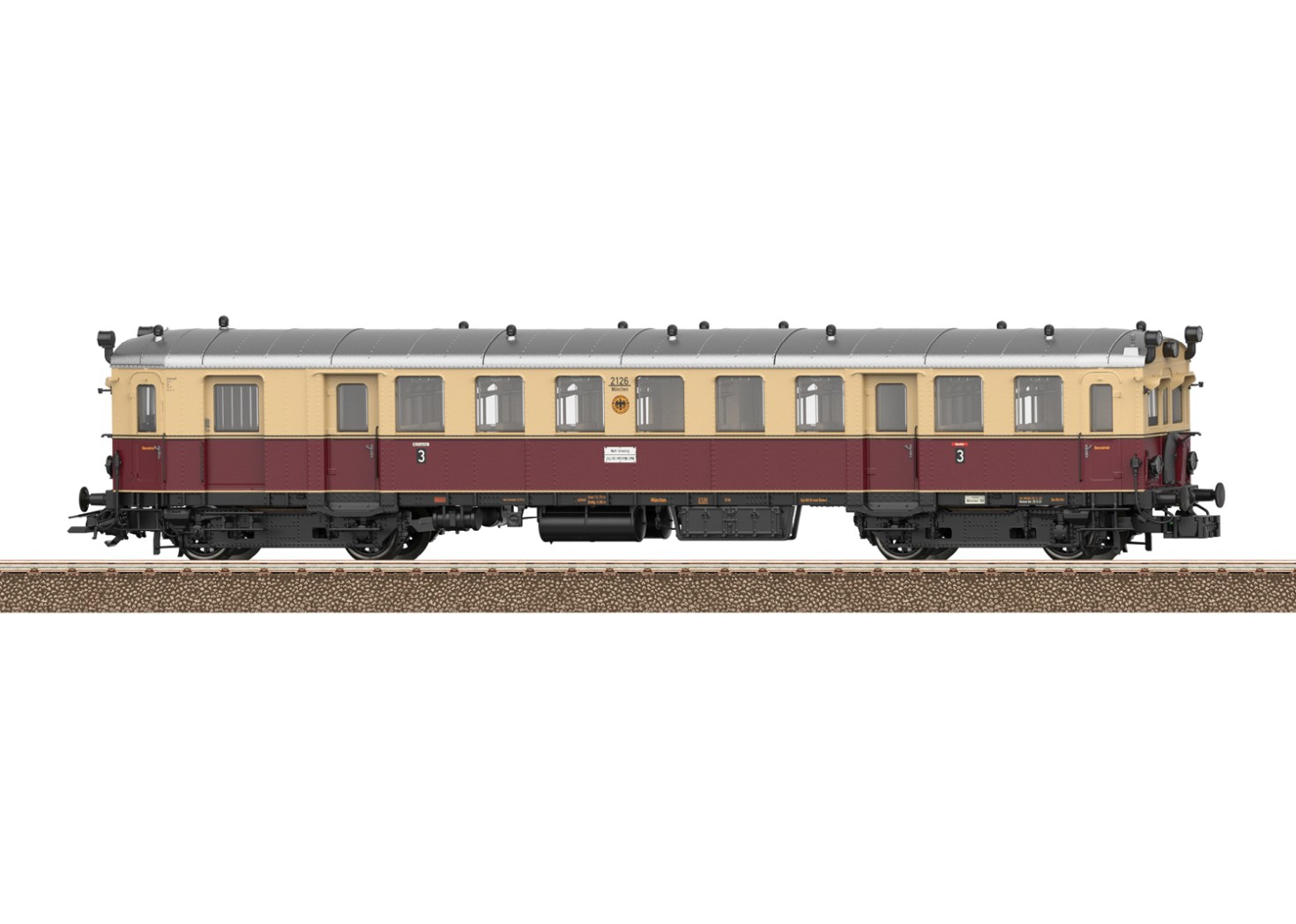 Vorbild: Elektrischer Triebwagen elT mit Steuerwagen elS der Deutschen Reichsbahn-Gesellschaft (DRG). Ausführung mit Fronttüren am Triebwagen und Steuerwagen mit stirnseitigen Übergangsblechen. Oben angebrachte Zugschlusssignal-Laternen. Anordnung der Sandkästen im Ablieferungszustand. Farbgebung in beige/weinrot. Betriebsnummern elT 1126 und elS 2126. Steuerwagen elS mit Laufschild äNach Ismaning - Nach München Ost Pbf?. Heimatbahnhof München. Betriebszustand 1932.Modell: Triebwagen elT als angetriebene Einheit mit Digital-Decoder und umfangreichen Geräuschfunktionen. Geregelter Hochleistungsantrieb. Vier Achsen angetrieben. Haftreifen. Zweilicht-Spitzensignal und zwei rote Schlusslichter über beide Einheiten an den äußeren Stirnseiten mit der Fahrtrichtung wechselnd, digital schaltbar. Zusätzlich 3. Spitzenlicht oben als Zugbegegnungslicht jeweils in Fahrtrichtung vorne separat digital schaltbar. Beide Einheiten sind über eine mehrpolige Kupplung fest miteinander Gekuppelt. Innenbeleuchtungen im Triebwagen elT und Steuerwagen elS konventionell in Betrieb, digital schaltbar. Beleuchtung mit wartungsfreien warmweißen Leuchtdioden (LED). Spitzensignal an Triebwagenseite 1 und Steuerwagenseite 2 jeweils separat digital abschaltbar. Führerstandbeleuchtung an den äußeren Führerständen separat digital schaltbar.Mit Pufferspeicher. Sehr detaillierte Ausführung von Fahrwerk und Aufbau. Wagenkasten und Wagenboden aus Metall. Mehrteilige und mehrfarbige Inneneinrichtung. Nachgebildete Glocke, Bremsleitungen und zwei Kurzkupplungsköpfe liegen bei. Gesamtlänge über Puffer ca. 46,8 cm.Dieses Modell finden Sie in Wechselstromausführung im Märklin H0-Sortiment unter der Artikelnummer 39852.