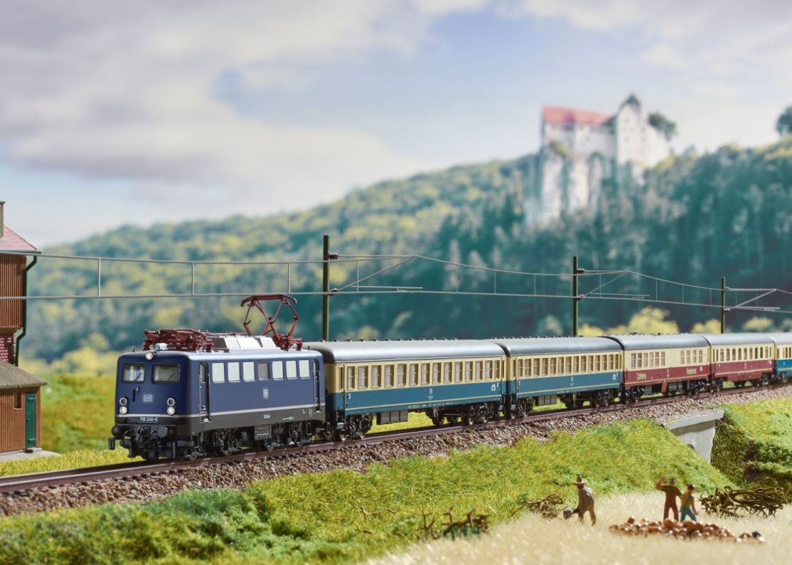 100 Jahre FD-ZügeVorbild: Einheits-Elektrolokomotive 110 246-6 der Deutschen Bundesbahn (DB). Kobaltblaue Grundfarbgebung. Ausführung mit Doppellampen, Kunststoffregenrinnen über den Frontfenstern und Führerstandstüren, Doppeldüsenlüftergitter (DDL), ungeteiltes Maschinenraumfenster mit Gummidichtung und stirnseitige Handgriffe. Zustand um 1988.Einsatz: Güter- und Personenzüge des Nah- und Fernverkehrs.Modell: Gehäuse und Träger aus Zinkdruckguss. Eingebauter Digital-Decoder und Geräuschgenerator zum Betrieb mit mfx und DCC. Motor mit Schwungmasse, 4 Achsen angetrieben, Haftreifen. Stirnbeleuchtung und Schlusslichter mit der Fahrtrichtung wechselnd, mit warmweißen Leuchtdioden, Führerstandsbeleuchtung, digital schaltbar. Kinematik für Kurzkupplung. Angesetzte Griffstangen. Länge über Puffer 103 mm.