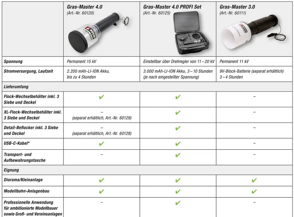 Der NOCH Gras-Master 4.0 bringt die elektrostatische Begrasung im Modell-Landschaftsbau auf ein neues Level! Die vierte Generation ist in zwei Varianten erhältlich und überzeugt mit innovativen Features wie integriertem Akku und dem praktischen Flock-Wechselbehälter-System. Dank einer permanenten Spannung von 15 kV (Gras-Master 4.0). Der Gras-Master gehört zu den leistungsstärksten Geräten am Markt. Ob kurze oder lange Grasfasern der Gras-Master meistert alle Herausforderungen mühelos.